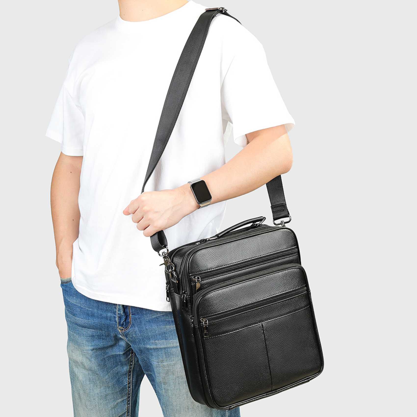 Ανδρική Δερματίνη Τσάντα Ώμου – Κομψή, Ελαφριά και Πρακτική Κομψότητα και Αντοχή για Κάθε Ημέρα Η ανδρική δερματίνη τσάντα ώμου σε μαύρο χρώμα συνδυάζει διαχρονική κομψότητα και πρακτικότητα. Το ποιοτικό υλικό δερματίνης προσφέρει ανθεκτικότητα στη χρήση, ενώ ταυτόχρονα χαρίζει πολυτελή υφή που ταιριάζει με κάθε στυλ, είτε βρίσκεσαι στη δουλειά είτε σε καθημερινές βόλτες. Ευρύχωρη Χωρητικότητα με Έξυπνη Οργάνωση Η τσάντα προσφέρει δύο κύριες θήκες με φερμουάρ, σημειωματάρια, κινητό, πορτοφόλι και γυαλιά. Επιπλέον, διαθέτει 2 μπροστινές τσέπες με φερμουάρ και πίσω τσέπη με φερμουάρ, ώστε να κρατάς τα αντικείμενα που χρειάζεσαι πιο συχνά πάντα εύκολα προσβάσιμα. Ταυτόχρονα, η εσωτερική τσέπη με φερμουάρ προσθέτει ασφάλεια για μικροαντικείμενα και έγγραφα. Έτσι, έχεις πάντα τα πράγματά σου οργανωμένα και προστατευμένα. Ευελιξία στη Μεταφορά Με τον ρυθμιζόμενο ιμάντα ώμου και την ενισχυμένη δερμάτινη χειρολαβή, μπορείς να την κρατήσεις όπως σε βολεύει. Χρησιμοποίησέ την στον ώμο για περισσότερη άνεση ή κράτησέ την στο χέρι για πιο κλασικό ύφος. Έτσι, η τσάντα προσαρμόζεται στις ανάγκες σου είτε σε επαγγελματικές συναντήσεις είτε σε ταξίδια. Premium Λεπτομέρειες που Κάνουν τη Διαφορά Η δερματίνη υψηλής ποιότητας, τα στιβαρά μεταλλικά φερμουάρ και οι ενισχυμένες ραφές εξασφαλίζουν μακροχρόνια χρήση. Επιπλέον, οι προσεγμένες λεπτομέρειες στον σχεδιασμό προσθέτουν κομψότητα, ενώ η ελαφριά κατασκευή της (μόνο 0.68 kg) την καθιστά ιδανική για καθημερινή μεταφορά. Γιατί να Επιλέξεις την Ανδρική Δερματίνη Τσάντα Ώμου Κατάλληλη για tablet 9.7”, σημειωματάρια και όλα τα βασικά αντικείμενα. Διαθέτει πολλές θήκες για οργάνωση και άμεση πρόσβαση. Προσφέρει δύο τρόπους μεταφοράς, στον ώμο ή στο χέρι. Ενσωματώνει κομψό design και ανθεκτική κατασκευή.