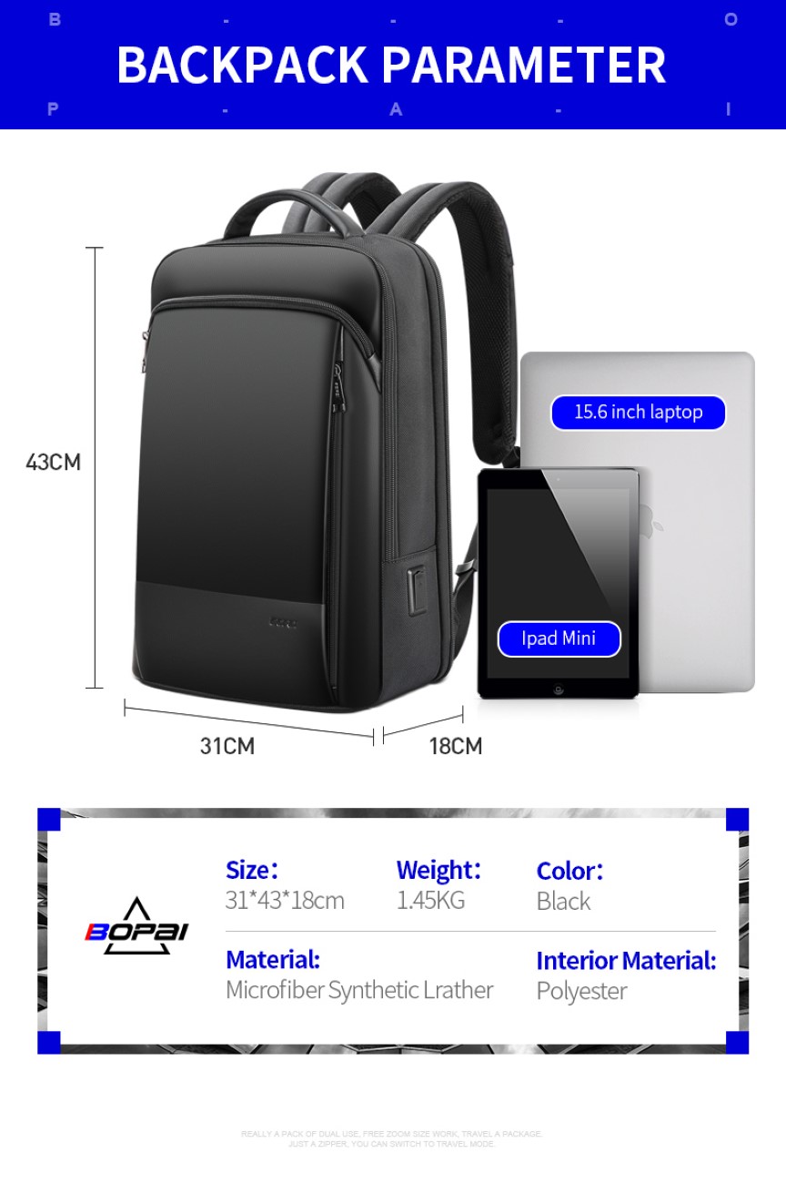 Η BOPAI είναι διεθνής Leader ως The Multi-functional Business Backpacks Creator ιταλικών σχεδίων γνήσιου δέρματος υψηλής ποιότητας, που ιδρύθηκε το 1999, ειδικεύεται στις τσάντες πλάτης, συμπεριλαμβανομένων των επαγγελματικών σακιδίων. 【Έγχρωμοι ιμάντες με φερμουάρ】 - περιλαμβάνουν 4 μπλε και 4 πορτοκαλί ιμάντες με φερμουάρ που μπορείτε να αλλάξετε μόνοι σας για να δέσετε στα φερμουάρ. (Κάθε σακίδιο έχει 8 ιμάντες με φερμουάρ δωρεάν) 【Έξυπνη σχεδίαση αύξησης】 - Mόλις τραβήξετε το έξυπνο μεγεθυσμένο φερμουάρ, θα υπάρχει επιπλέον 40% χώρος για το απόθεμα. Η καλύτερη επιλογή για σύντομο ταξίδι και εύκολη καθημερινότητα. 【Σχεδιασμός θύρας γρήγορης φόρτισης USB】 - Με εξωτερική θύρα USB και ενσωματωμένο καλώδιο συνδεδεμένο με το power bank σας μέσα στο οποίο θα φορτίζει το τηλέφωνό σας πιο εύκολα. (Δεν περιλαμβάνεται το power bank) 【Αόρατη αντικλεπτική σχεδίαση】 - Μια κρυφή τσέπη με φερμουάρ εξοπλίζει στο πίσω μέρος για να πακετάρετε το πορτοφόλι, τα χρήματα, τις κάρτες σας. Αυτός ο αόρατος σχεδιασμός αυξάνει την ασφάλεια των προϊόντων σας Value Inside. 【Μεγάλη χωρητικότητα】 -Απομονωμένη θήκη για φορητό υπολογιστή ταχείας πρόσβασης κατάλληλη για υπολογιστή 15, 6 ιντσών, ευρύχωρο μέγεθος σακιδίου 24 λίτρων. Το σακίδιο είναι κατασκευασμένο από αδιάβροχο δέρμα και ανθεκτικά βαλλιστικά νάιλον υλικά. Ο σχεδιασμός που αναπνέει για την πίσω πλευρά σας αποτρέπει από το ζεστό και τον ιδρώτα. (Η καλύτερη επιλογή για εσάς στα ταξίδια, τις επιχειρήσεις, το γραφείο ή το σχολείο). ΔΙΑΣΤΑΣΕΙΣ:43Χ18Χ31 cm